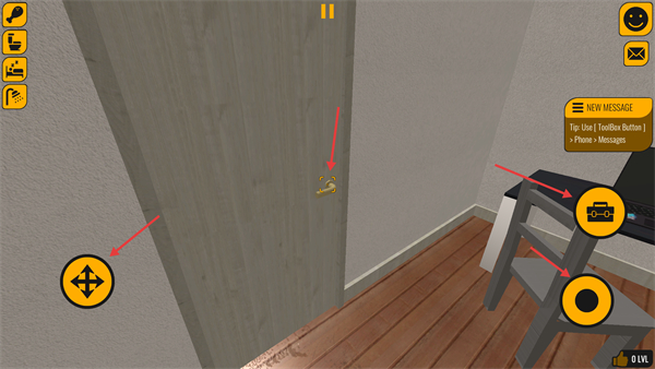 2、玩家進入房間場景中,可以四處探索去與物品互動,移動到門面前時候,點擊右邊互動鍵即可開門繼續探索新的區域。