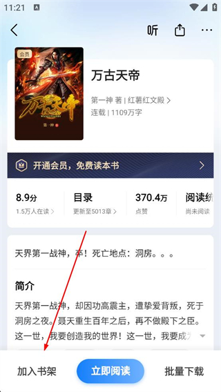 2、在小說詳情頁查看書籍評分、簡介等內容,點擊加入書架或立即閱讀按鈕,開始閱讀該小說內容。