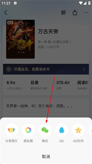 4、點擊頁面的分享按鈕彈出分享選項,可選擇分享圖片、朋友圈等渠道,將該小說分享給他人。