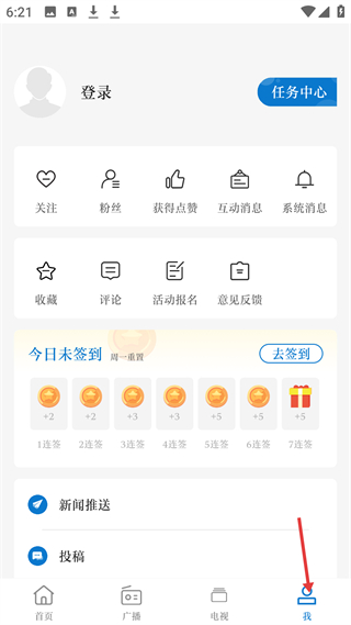 4、個人中心板塊可登錄、參與任務,有關注、收藏等功能,方便用戶管理賬號與互動,提升使用體驗,功能實用且便捷。