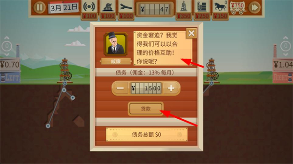 3、當資金短缺時,會觸發貸款界面,可選擇貸款金額,點擊貸款按鈕獲取資金,緩解資金壓力,繼續推進石油開采經營。