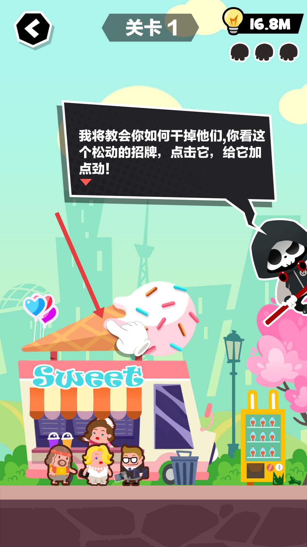 1、關卡1中,根據提示,找到松動的招牌,點擊它,給它加點勁,利用招牌來達成關卡目標。