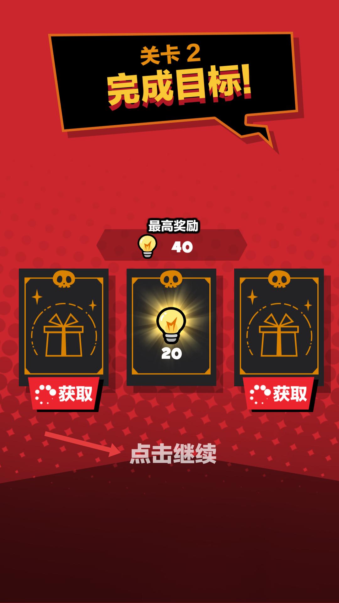 4、關卡2完成目標后,界面會顯示獎勵,點擊【點擊繼續】,就能領取獎勵并進入下一個環節。