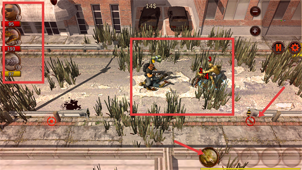 4、戰斗時留意左側角色狀態,及時掌握生命值等信息,遭遇僵尸圍攻,要靈活操作角色射擊,消滅僵尸可獲得金錢獎勵。
