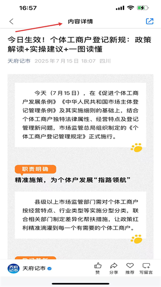 2、新聞資訊頁,發布經營主體登記、個體工商戶新規等政務信息,提供政策解讀與實操指引類內容。
