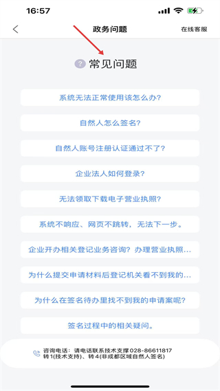4、常見問題頁,列出系統使用、簽名等問題,提供技術支撐電話,輔助用戶解決政務操作相關難題。