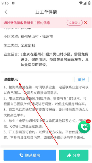 2、在業主單詳情頁面,瀏覽業主的裝修需求信息,包括小區名稱施工類型等內容,還能看到溫馨提示,了解溝通及服務相關注意事項。