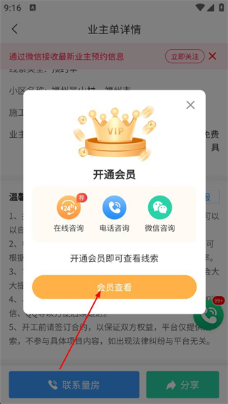 3、若要聯系業主獲取更多線索,點擊對應功能按鈕,彈出開通會員窗口,選擇開通會員可解鎖在線咨詢電話咨詢等更多溝通方式。