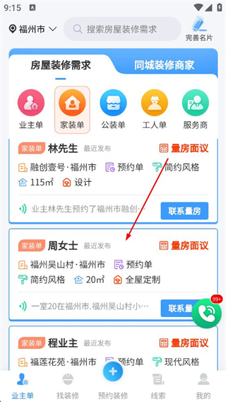 1、打開裝修接單寶軟件,進入家裝單頁面,可看到各類業主發布的裝修需求,選擇目標業主,點擊進入業主單詳情頁面查看具體需求。