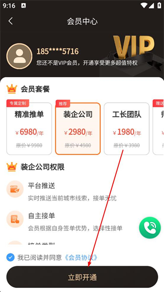 4、進入會員中心頁面,選擇合適的會員套餐,勾選同意會員協議,點擊立即開通按鈕,即可開通會員,享受精準推單自主接單等權益。
