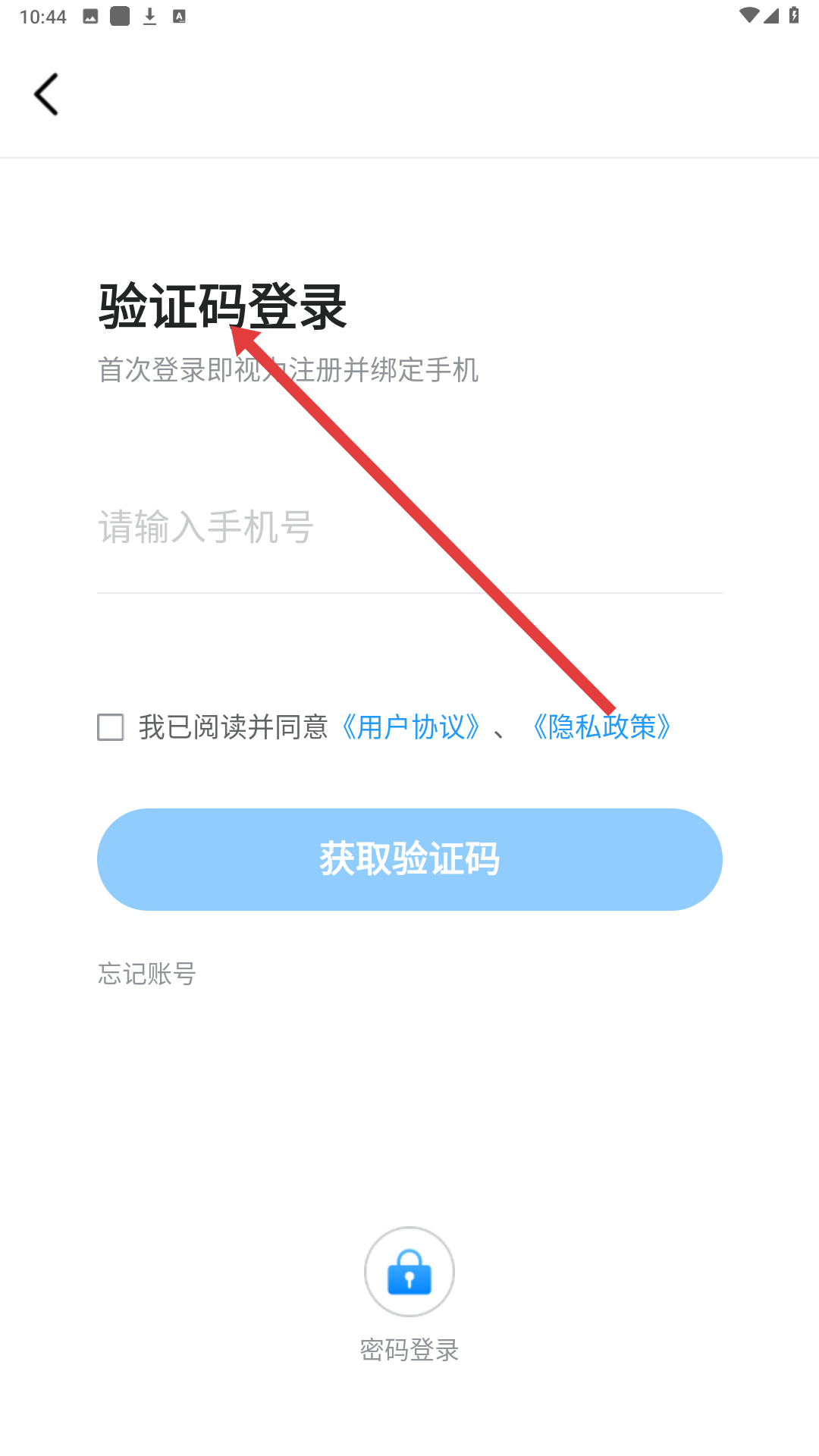 3、登錄頁面選擇驗證碼登錄,輸入手機號,勾選同意協議,點擊獲取驗證碼,完成賬號登錄操作。