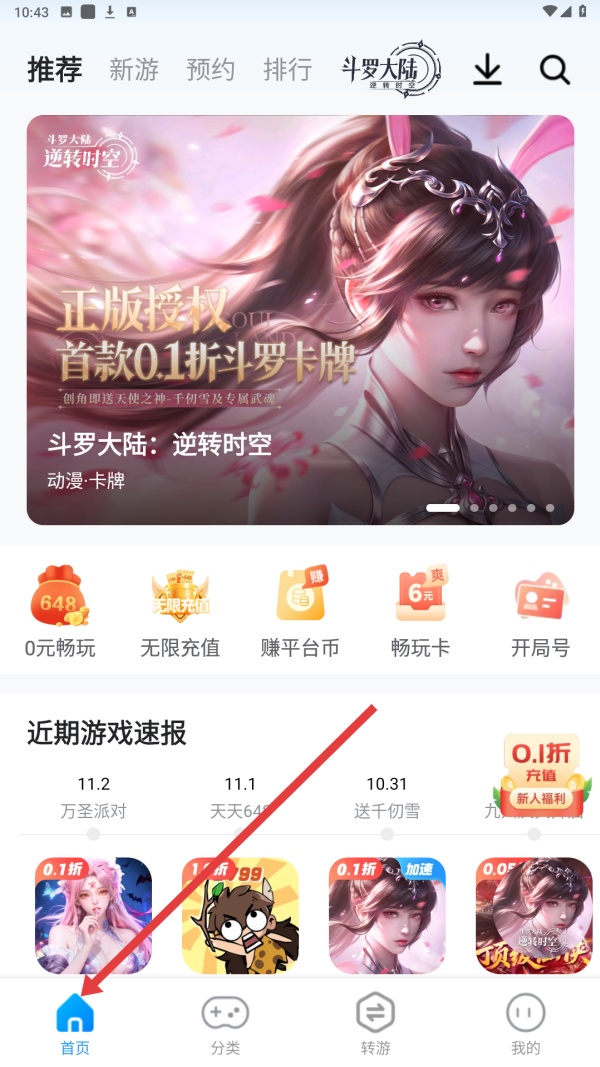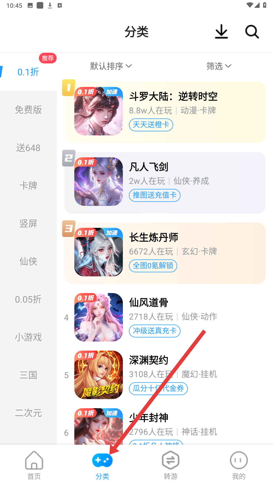 4、點擊底部分類標簽,進入游戲分類頁面,可看到不同折扣和類型的游戲列表,如斗羅大陸逆轉時空等,選擇感興趣的游戲。