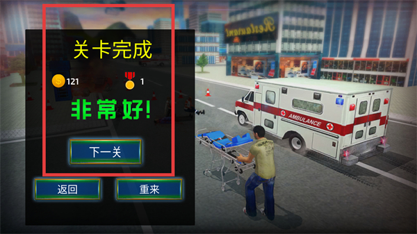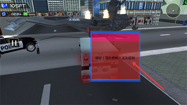 3、到達現場后將救護車停到目標位置,彈出很好現在把病人送到醫院的提示后,再次駕駛救護車,沿著路線將病人安全送往醫院。