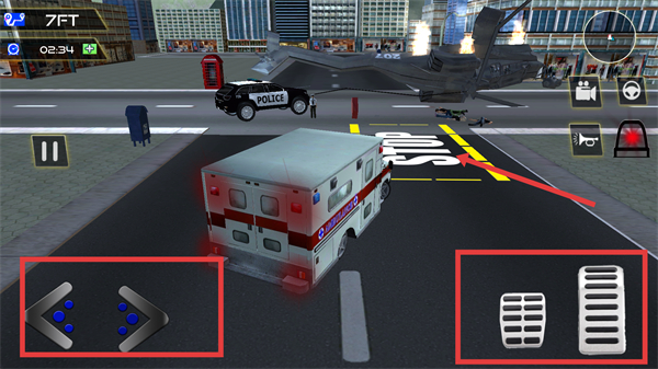 2、玩家在駕駛救護車時,用左側左右箭頭控制方向,右側踏板控制車速,根據場景情況靈活操作前往目標地點。