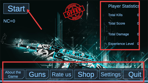 1、進入游戲主界面,點擊顯眼的Start按鈕,即可開啟極端僵尸生存射擊之旅,開啟后能看到玩家統計數據等信息。