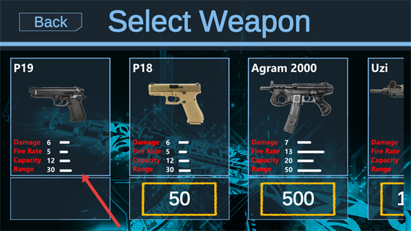 2、接著來到武器選擇界面,可挑選不同武器,像P19免費手槍,它傷害6、射速5、彈容量12、射程30,根據需求選好武器才能更好應對僵尸。