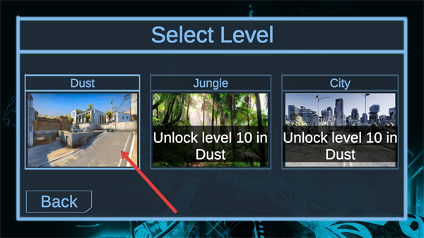 3、接著到關卡選擇界面,初始可選擇Dust場景關卡,另外Jungle和City場景關卡需在Dust場景達到10級才能解鎖。