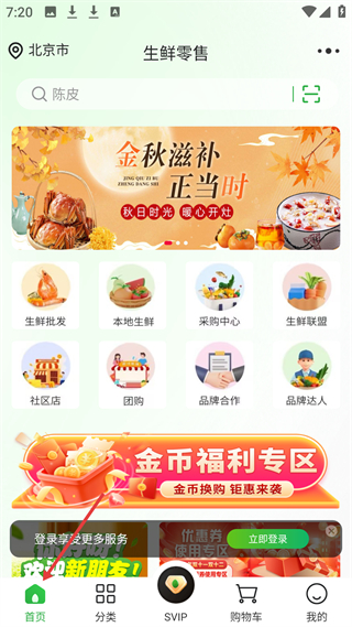 1、首頁定位北京,有搜索欄,金秋滋補活動banner,生鮮批發等分類入口,還有金幣福利專區,提示登錄享更多服務。