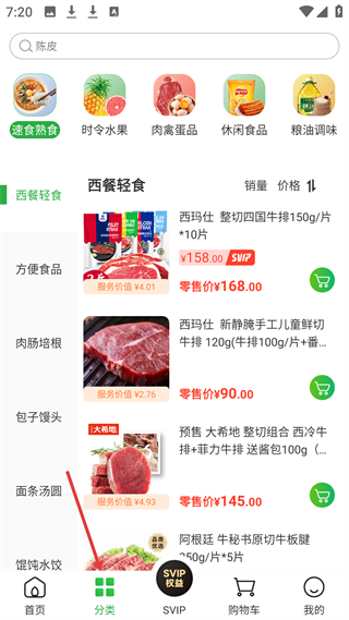 2、分類頁有速食熟食等分類,展示西餐輕食商品如西瑪仕牛排,標注價格和服務價值,部分商品有SVIP標識。