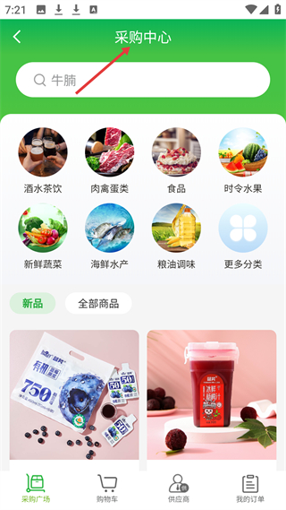 3、采購中心頁,有酒水茶飲等分類,展示新品藍莓汁、楊梅汁等,底部有采購廣場、購物車等功能入口。