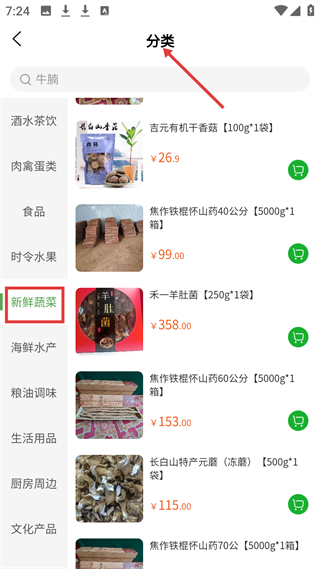 4、分類詳情頁,左側有酒水茶飲等分類,展示新鮮蔬菜類商品如吉元干香菇、禾一羊肚菌,標注價格,右側有購物車按鈕。