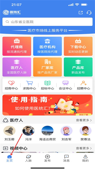 1、主頁是醫療線上服務平臺,有代理商、醫療機構等板塊,還有招.商等中心及視頻中心,提供醫療人脈、產品等服務。