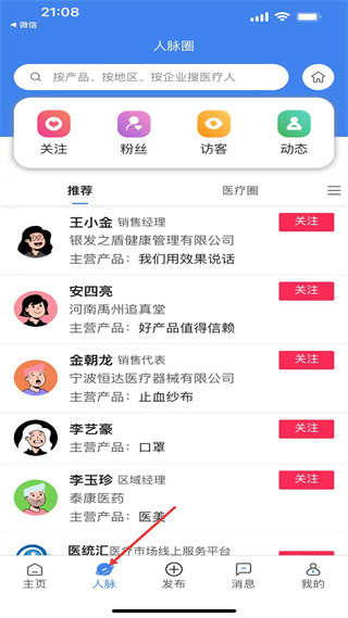 2、人脈圈可按產品等搜醫療人,有關注等板塊,展示醫療行業人員及主營產品,方便拓展醫療人脈資源。