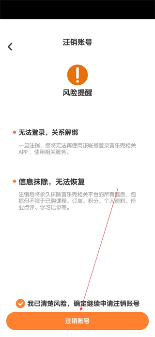 2、在設置頁面中找到注銷賬號選項并點擊,進入注銷頁面后,仔細閱讀風險提醒內容,了解注銷后無法登錄信息抹除等后果。