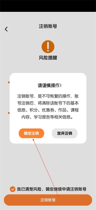 3、確認清楚風險后勾選我已清楚風險確定繼續申請注銷賬號的選項,然后點擊注銷賬號按鈕,觸發二次確認的彈窗提示。