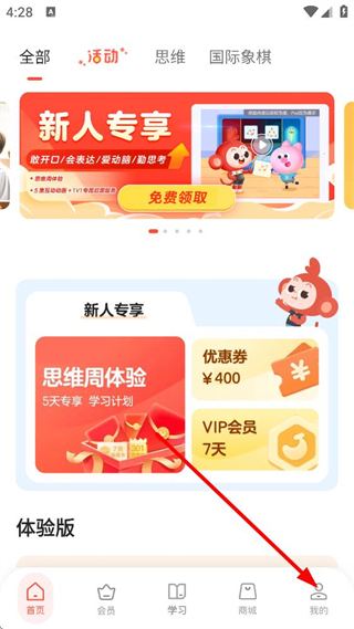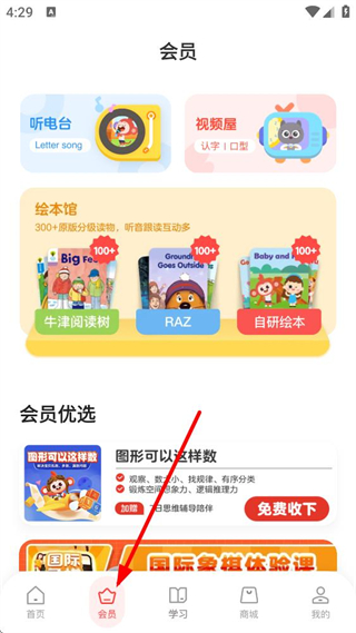4、會員界面的會員優選區域,有各類學習資源推薦,部分資源旁設免費收下按鈕,點擊可獲取對應的啟蒙學習內容,助力思維培養。