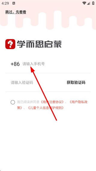 2、點擊個人中心的登錄、注冊,進入啟蒙的登錄頁面,需輸入手機號,獲取并填寫驗證碼,同時勾選相關協議,完成賬號的登錄流程。