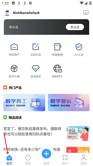 1、首頁,有修改商戶等功能,還有數幣開通等服務,展示熱門產品和精品閱讀,助力商戶開展業務和了解行業動態。
