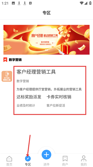 2、專區界面,有客戶經理營銷工具,提供數字營銷服務,包含達標獎勵派發等功能,幫助客戶經理開展營銷拓展業務。