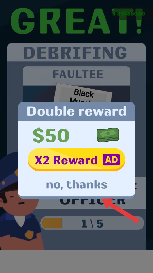 4、成功處理事件后,會獲得獎勵,可選擇觀看廣告雙倍獲取獎勵,也能點擊no,thanks,領取基礎獎勵。