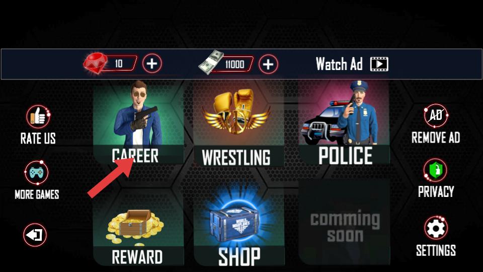 1、進入游戲主界面,能看到CAREER,WRESTLING,POLICE等選項,還有REWARD,SHOP等功能按鈕,可根據喜好開啟不同玩法。