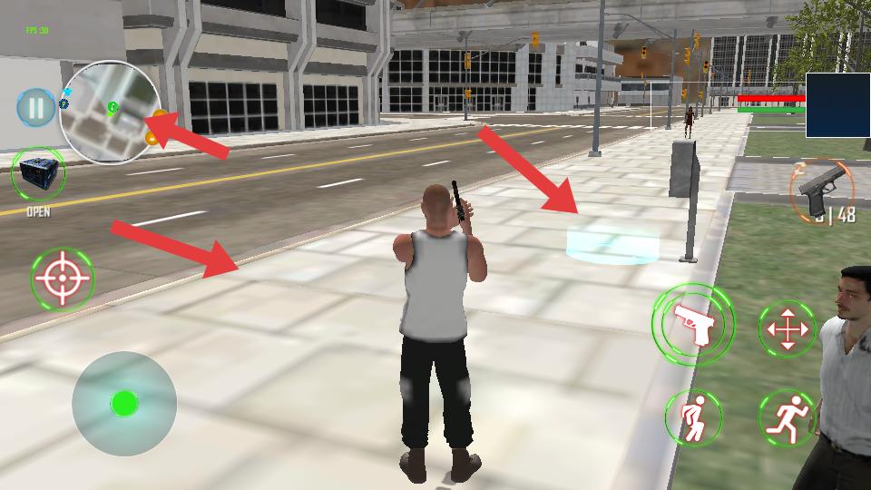 3、在城市街道場景,可操控角色移動,左上角小地圖能查看位置,右側有手槍等武器按鈕,點擊可使用武器,應對可能出現的狀況。