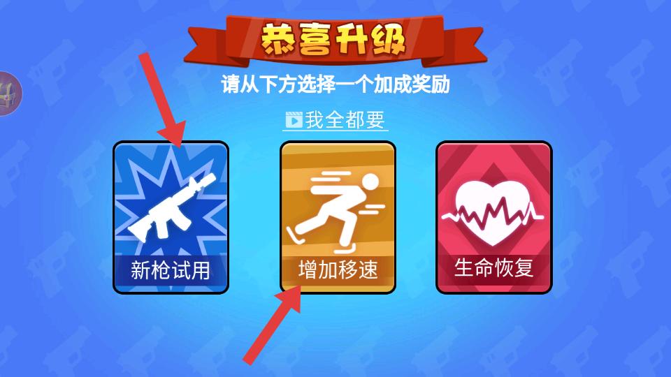 3、升級時會出現加成獎勵選擇界面,有新槍試用,增加移速,生命恢復等選項,可挑選一個,助力后續戰斗。
