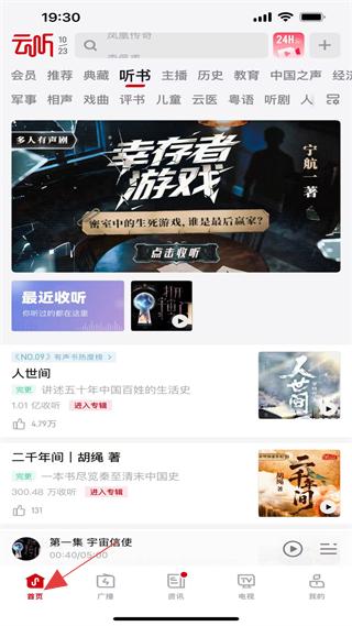 1、聽書板塊推幸存者游戲有聲劇,人世間、二千年間等熱榜作品,涵蓋小說、歷史,滿足聽書需求,內容多元。