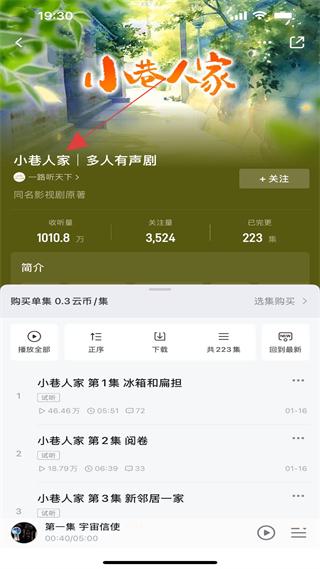 2、有聲劇板塊的小巷人家多人有聲劇,收聽量超千萬,可試聽、購買劇集,呈現精彩故事,豐富有聲劇體驗。