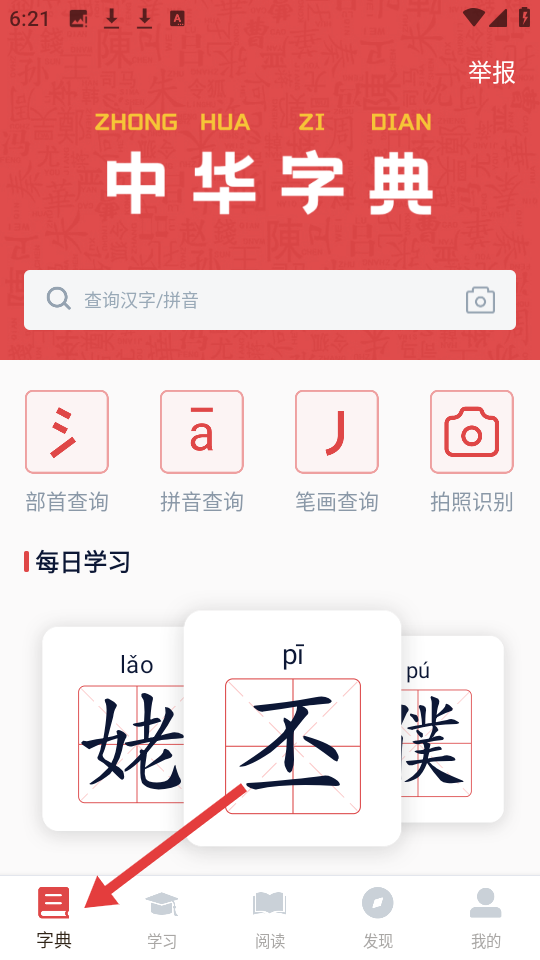 1、點擊字典紅色背景搭配傳統元素,具備漢字拼音查詢功能,提供部首拼音等多種查詢方式,還設有每日學習模塊展示漢字。