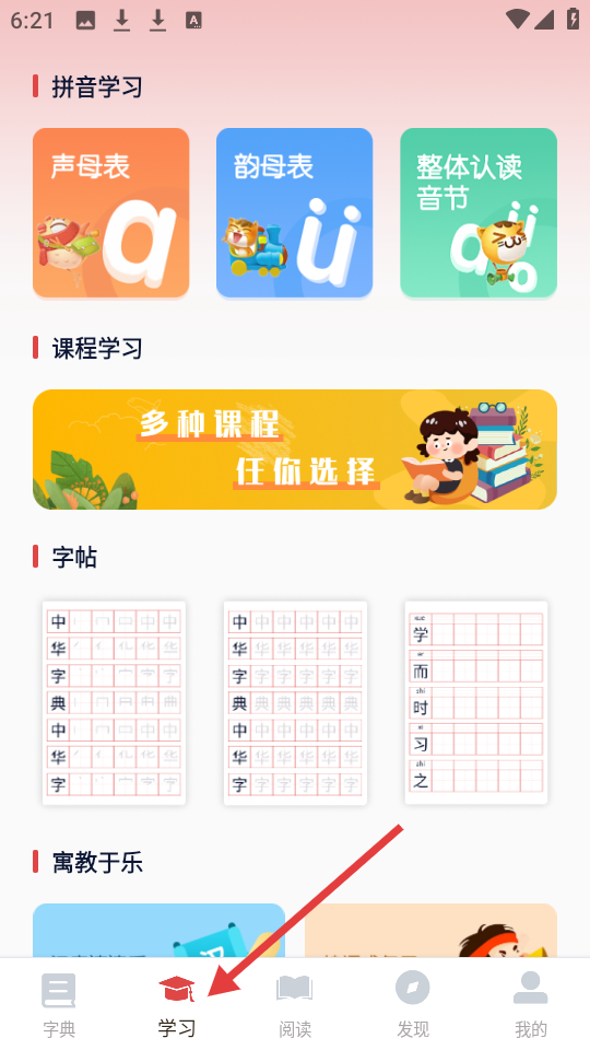 2、學習頁面劃分拼音學習、課程學習、字帖、寓教于樂等區域,其中拼音學習含聲母表等內容助力語言基礎學習。