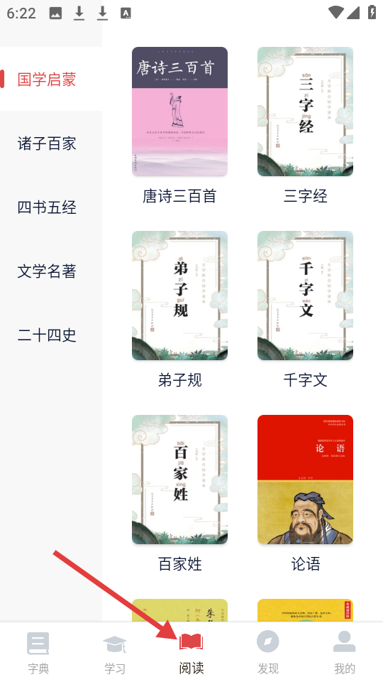 3、閱讀界面以國學啟蒙為核心,呈現諸子百家、唐詩三百首、三字經等經典國學著作滿足閱讀需求。