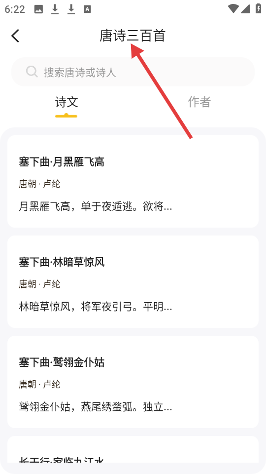 4、點擊唐詩三百首詳情頁,可按詩文或作者搜索,展示具體唐詩列表,包含作者信息與詩文片段方便深入學習唐詩。