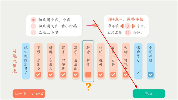 1、打開古古識字軟件進入課程選擇頁面,選定對應學習階段后,勾選要學習的課程模塊,點擊完成按鈕進入學習界面。