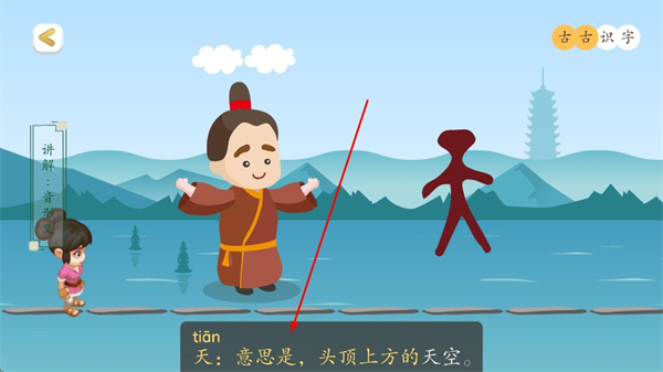 4、在漢字學習環節中查看漢字的讀音及含義講解,跟隨引導了解漢字的意思,完成該漢字的學習內容。