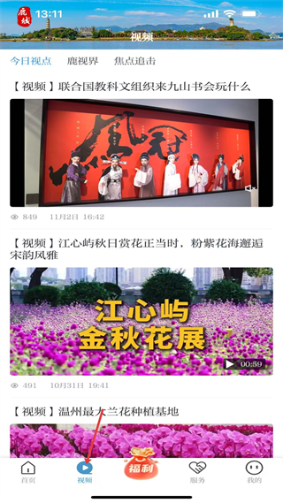 2、視頻板塊有今日視點等分類,展示聯合國教科文組織九山書會、江心嶼秋日賞花等視頻,呈現本地文化與文旅動態。