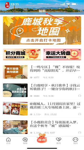 3、福利板塊展示鹿城秋季地圖、積分商城、幸運大轉盤等福利活動,還有健康、文化、喜劇等資訊,提供本地福利與文化活動信息。