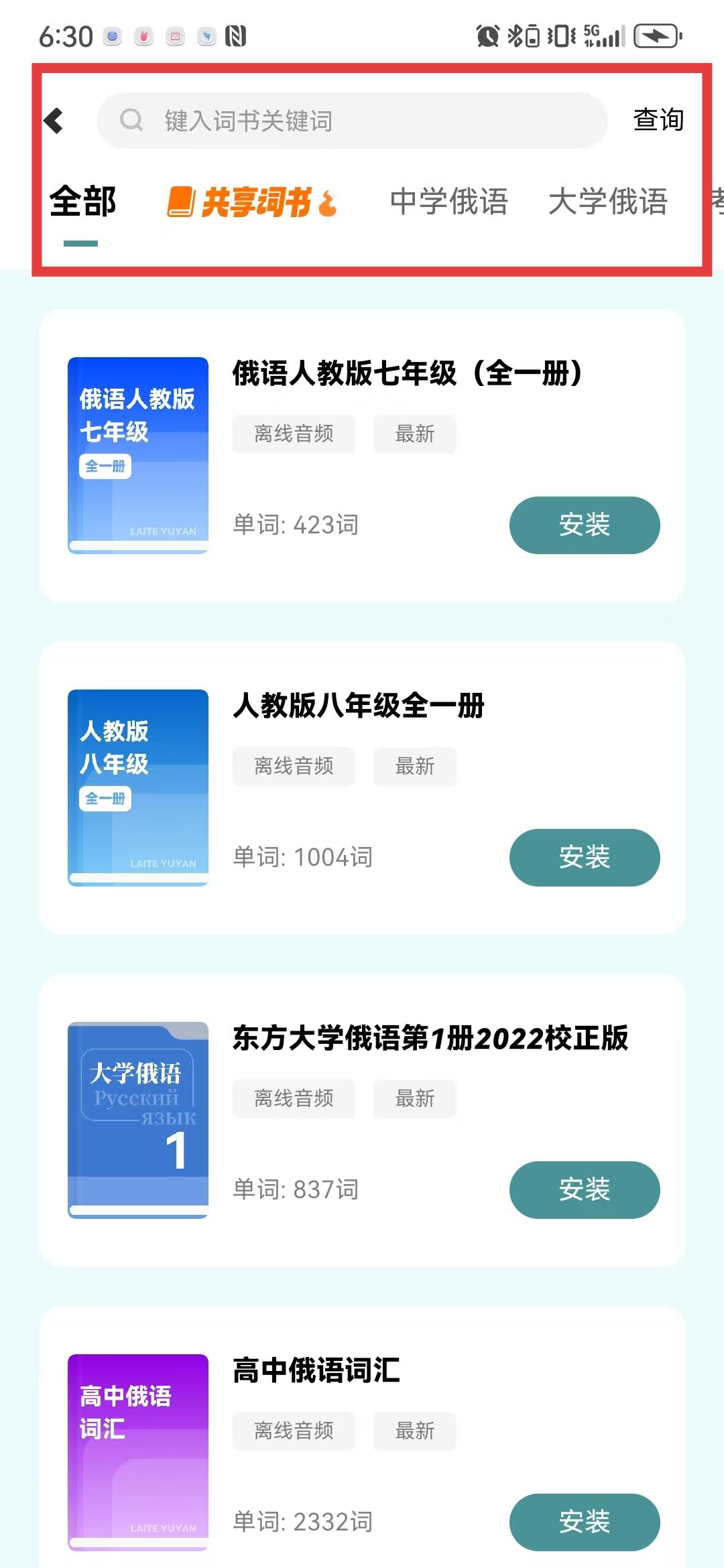 2、進入背單詞板塊后,可通過搜索框輸入詞書關鍵詞查詢,也可選擇共享詞書、中學俄語等分類,找到適合自己的俄語詞書,為背單詞做好準備。