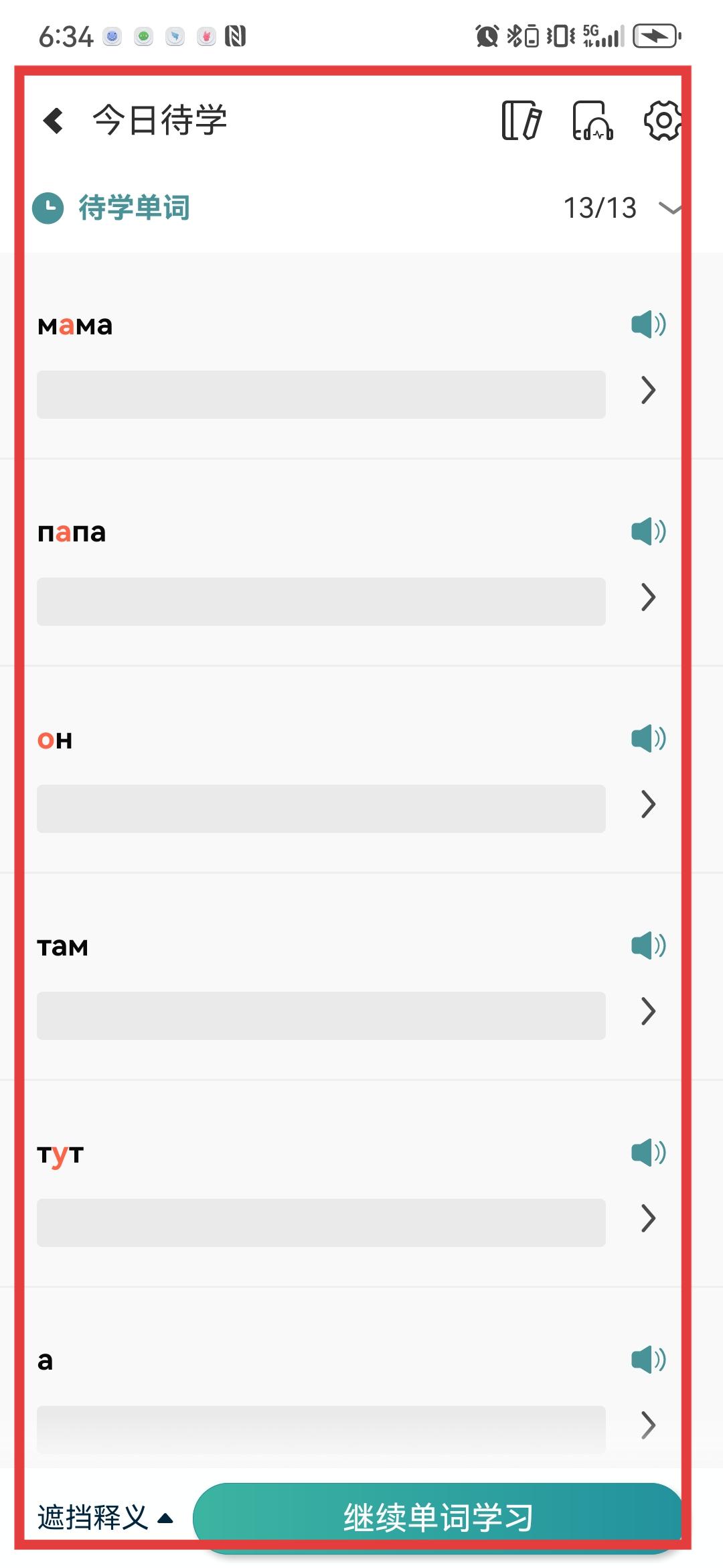 3、在初學者等模式頁面,查看今日學習、今日復習數據,點擊繼續學習按鈕,延續俄語單詞學習進程。