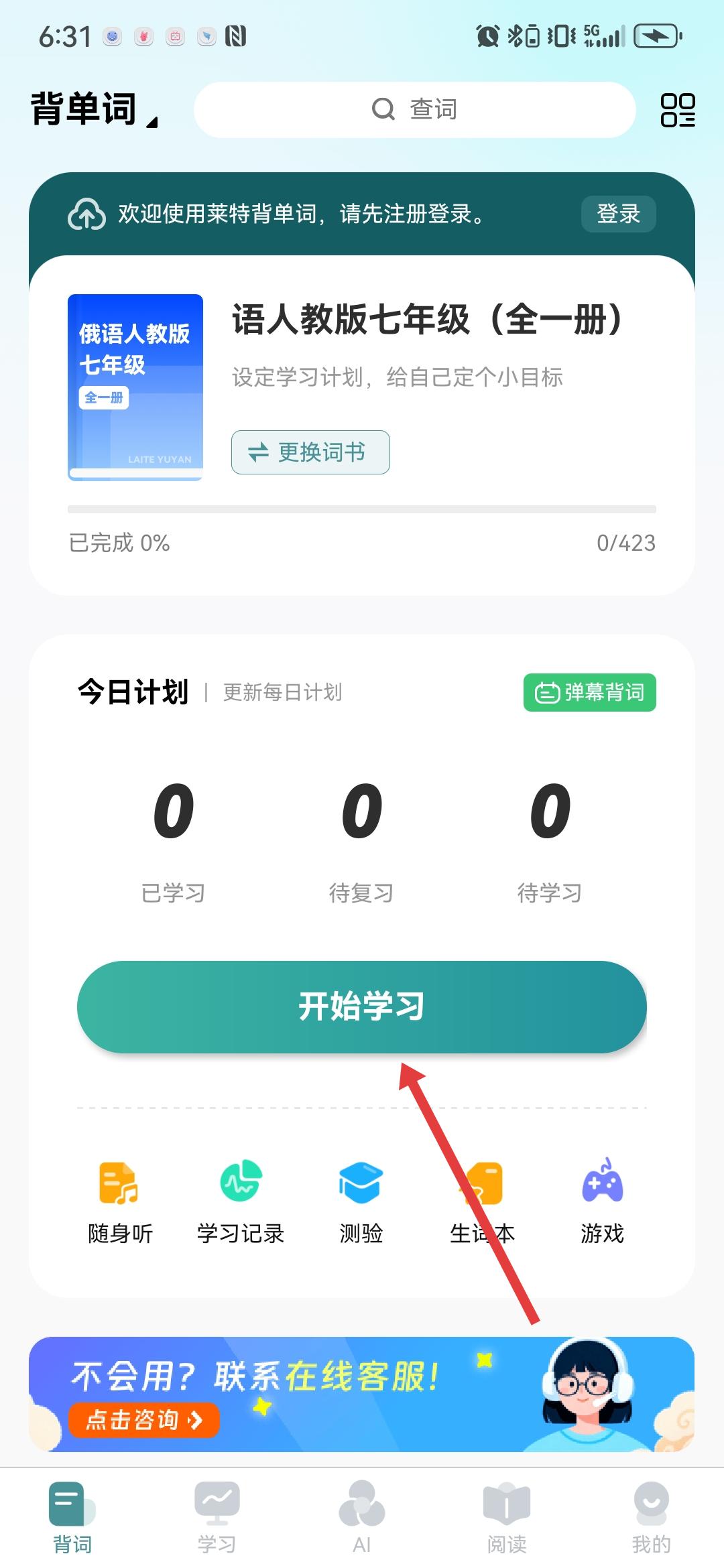 3、用戶選擇好詞書后,進入背單詞主頁面,點擊開始學習按鈕,即可按照計劃開始背誦俄語單詞,提升用戶的詞匯量。